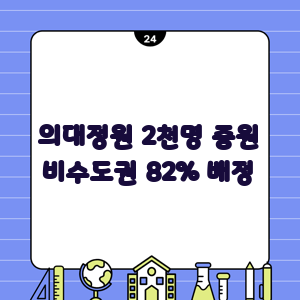 정부는 이번 의대 정원 증원 정책에서 82%를 비수도권에 배정하기로 했습니다. 이는 수도권 집중 현상을 완화하고 지역 간 의료 격차를 해소하기 위한 조치입니다. 그동안 의대 신입생의 대부분이 수도권 출신이었기 때문에, 지방 의료 기관 인력 확보에 어려움이 있었습니다.
